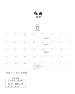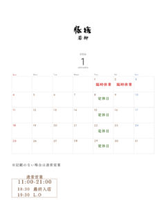 12/31(水) 11:00-20:00(最終入店17:30 ラストオーダー18:30)